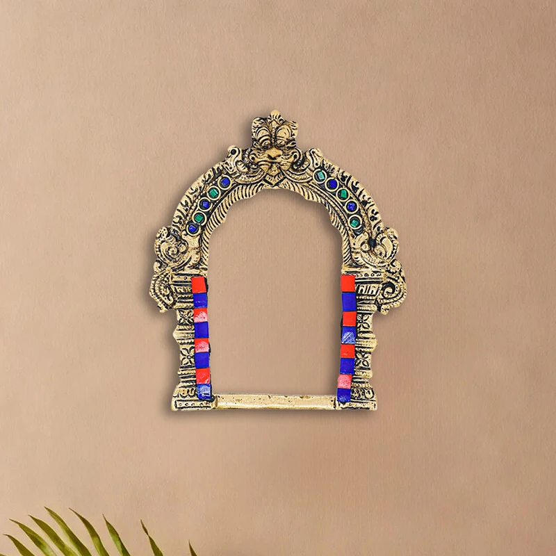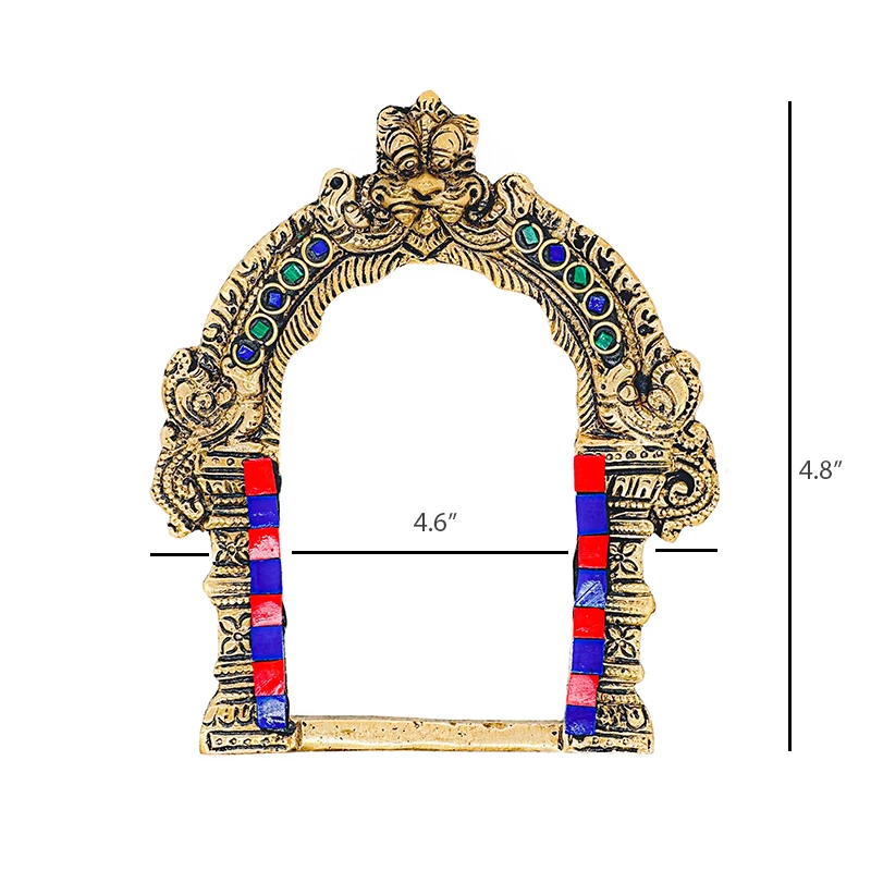 Adorned with delicate stone inlay work, this Narasimha Prabhavali adds a touch of color and richness, making it a visually striking piece. Its antique brass finish ensures a timeless appeal, while the compact size (4.8 inches tall) makes it suitable for smaller spaces like prayer rooms, entryways, or even as a decorative highlight in living rooms.