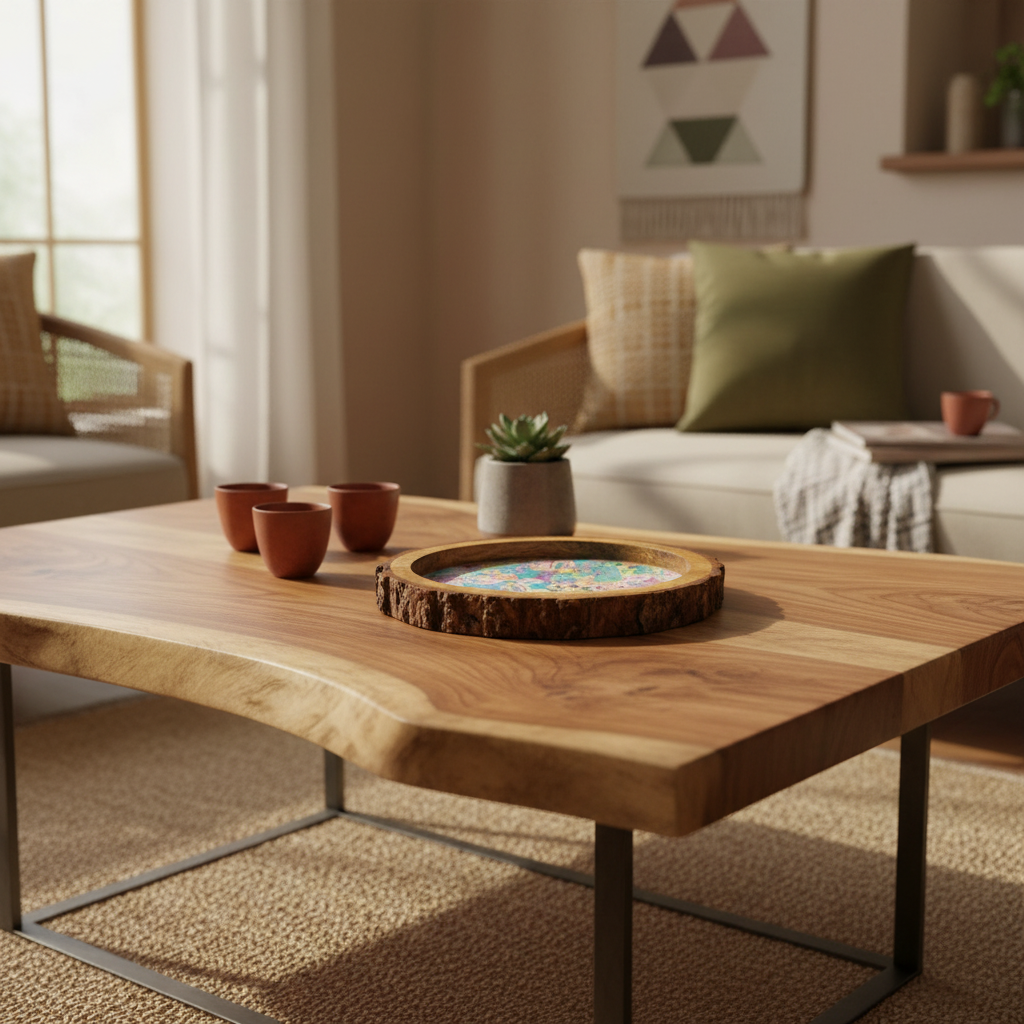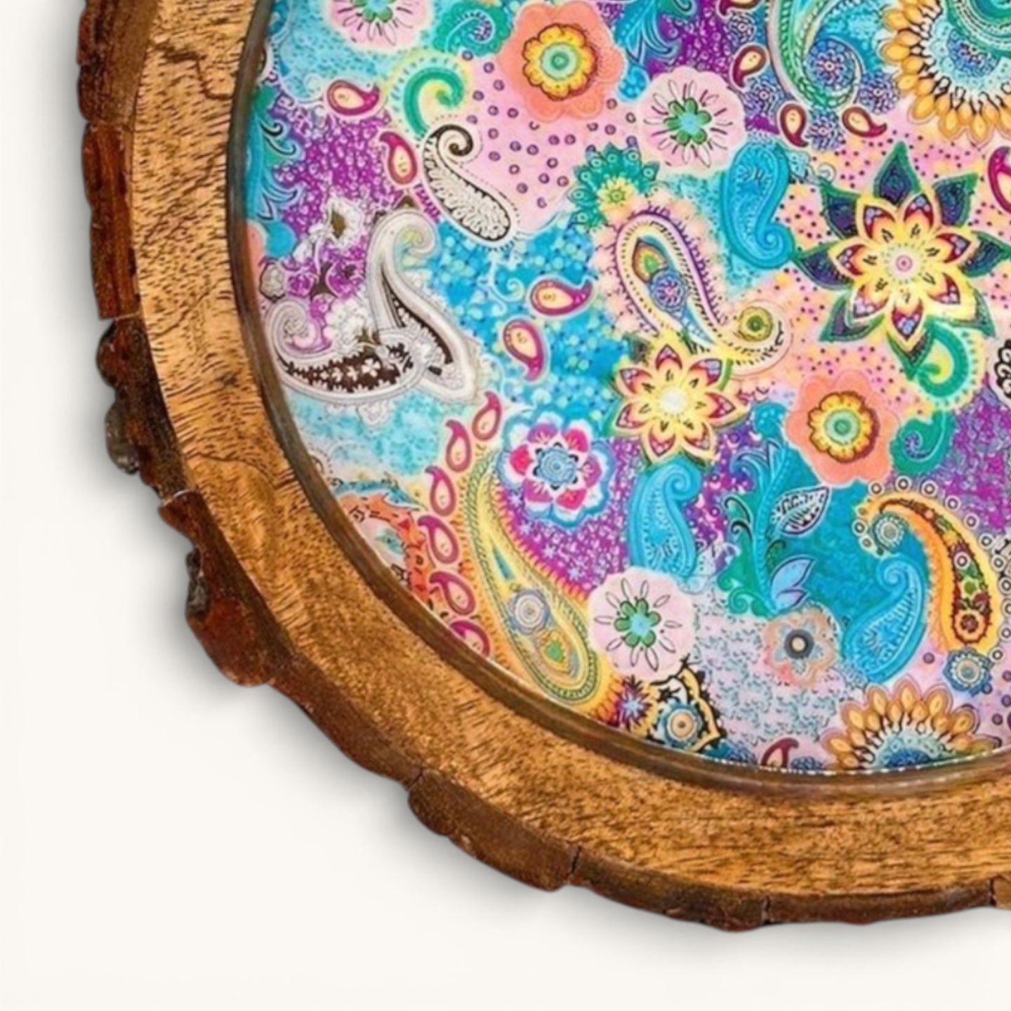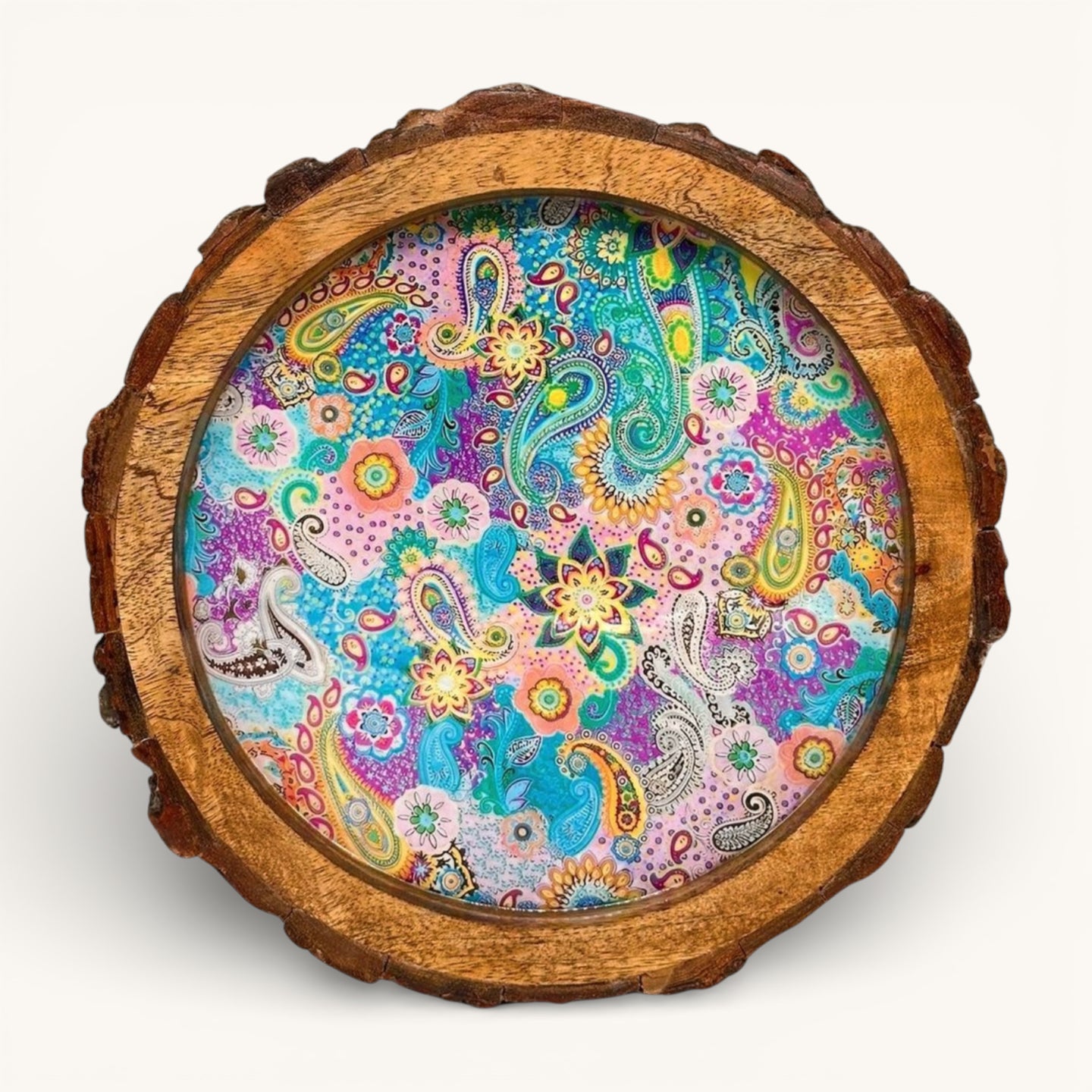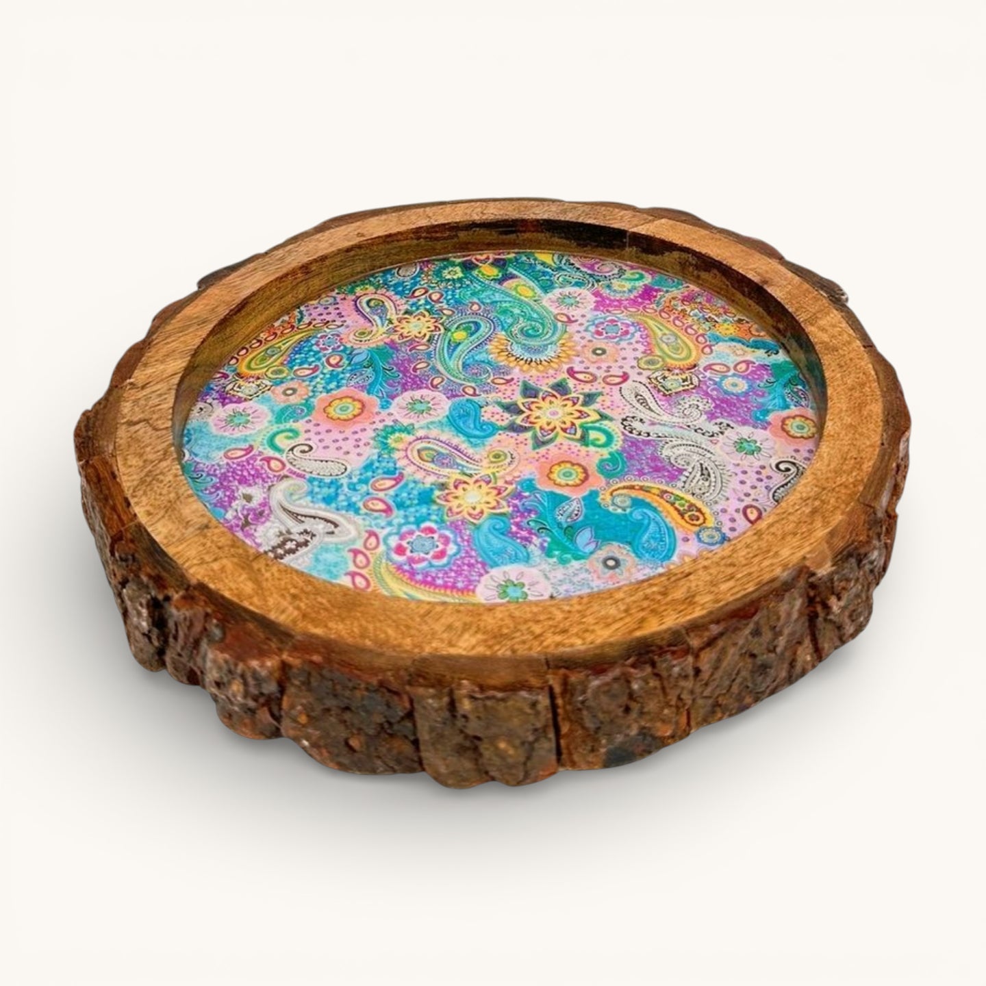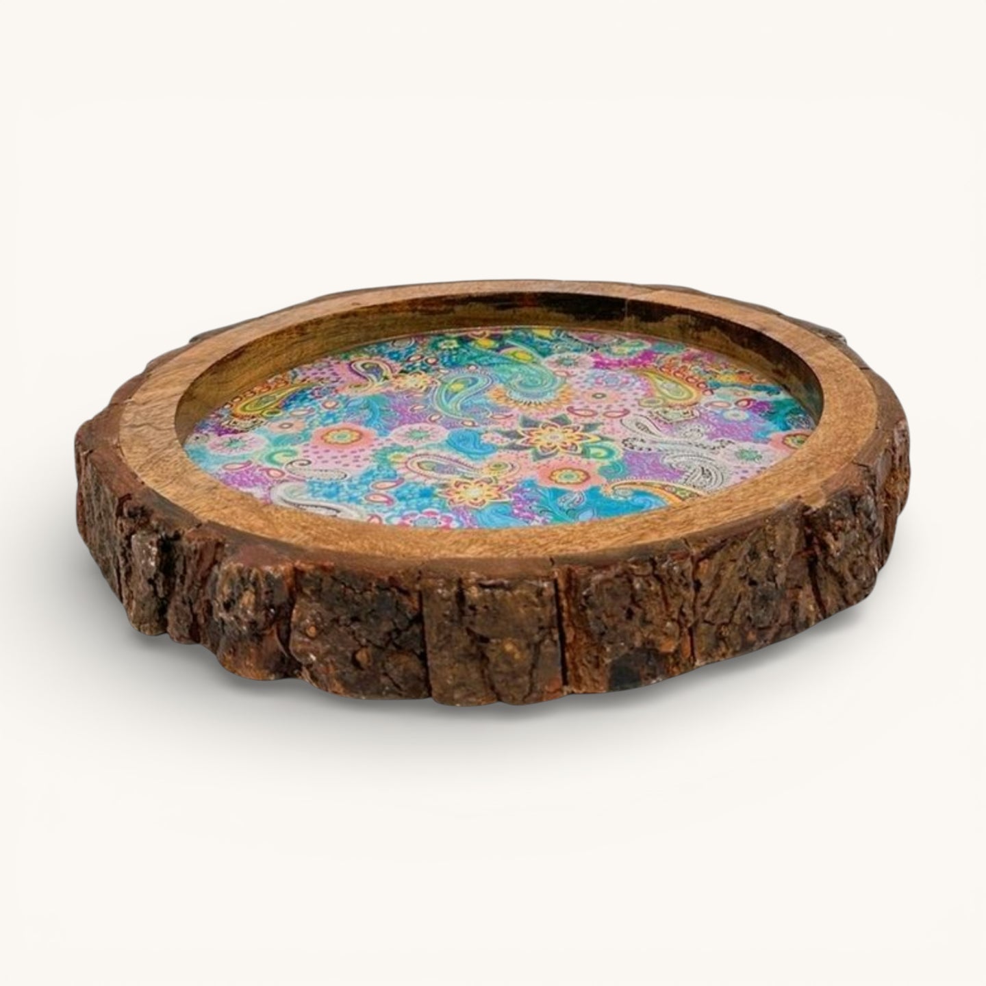Meenakari Print Wooden tray with Natural Bark Edges